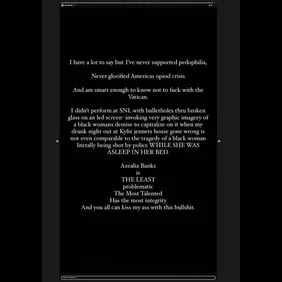 "I would never be Megan the stallion because I would never lie about getting shot in the foot to gain public sympathy and capitalize on the protect black women narrative conveniently when Breonna Taylor's untimely demise is National news just to then release a horrible album," said Banks. "Meg got some joints that I like, but she was ZERO diversity. I am a human and an artist, I'm not a commodity."