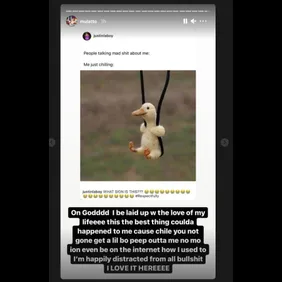 On Wednesday (January 27), Mulatto returned to once again share that she's smitten with her mystery man. "On Godddd I be laid up w the love of my lifeeee," the rapper wrote over a meme she posted to her Instagram Story. "This the best thing coulda happened to me cause chile you not gone get a lil bo peep outta me no mo ion even be on the internet how I used to."