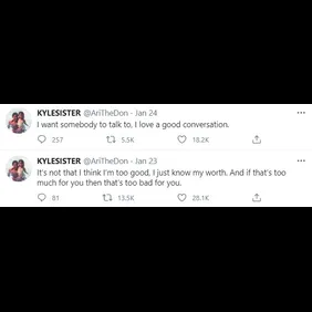 "It’s not that I think I’m too good, I just know my worth. And if that’s too much for you then that’s too bad for you," wrote Ari. She followed that up with, "I want somebody to talk to, I love a good conversation." Soon, she was asked why she wasn't just communicating with Moneybagg, but instead of answering, she continued to tweet more thoughts.