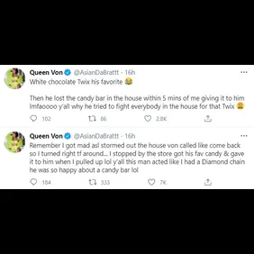 It seems that whenever she is personally confronted with a memory of Von, Asian Doll shares it on social media. On Wednesday (January 27), she returned with a story about the late rapper being happy with the little things. "Remember I got mad asl stormed out the house von called like come back so I turned right tf around," she wrote. "I stopped by the store got his fav candy & gave it to him when I pulled up lol y’all this man acted like I had a Diamond chain he was so happy about a candy bar lol."