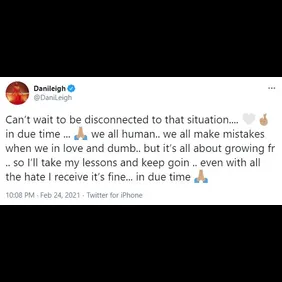 "Can’t wait to be disconnected to that situation.... in due time ... we all human," DaniLeigh tweeted. "We all make mistakes when we in love and dumb.. but it’s all about growing fr .. so I’ll take my lessons and keep goin .. even with all the hate I receive it’s fine... in due time." Swipe below to watch MeMe speak about her ex.