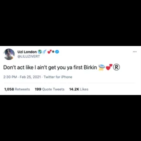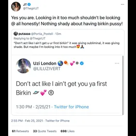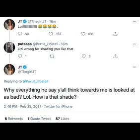 Their clash was short-lived because, minutes later, JT told a fan that Lil Uzi wasn't being rude to her and that she was texting the rapper right at that moment. "Yes you are [looking into it too much]," she told another Twitter user. "Shouldn’t be looking @ all honestly! Nothing shady about having birkin p*ssy! I’m texting him right now! He wasn’t STFU stop always minding ppl business reading it with a negative mind for I make your n***a shade you."