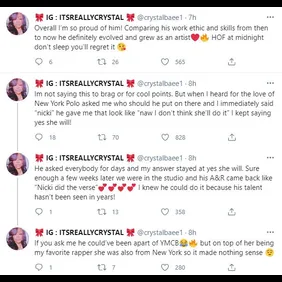 "Im not saying this to brag or for cool points," Crystal tweeted earlier today (June 10). "But when I heard for the love of New York Polo asked me who should he put on there and I immediately said 'nicki' he gave me that look like 'naw I don’t think she’ll do it' I kept saying yes she will! He asked everybody for days and my answer stayed at yes she will."
