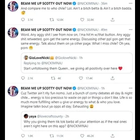 As people responded to that tweet, a fan wanted to know why Nicki was spending more time on TikTok than Twitter. "Cuz Twitter ain’t rlly fun nomo," she said. "Just a bunch of corny debates all day & night chile… energy is too precious to waste on ppl or things u don’t like. Life is so much more fulfilling when u give ur energy to what & who you love. Imagine talkn bout ya opps all day. Exhausting."