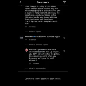 "Shit sadddd! Bum ass n***a," wrote Meek Mill on Mysonne's post about DJ Akademiks. "@meekmill let's hope when @akademiks runs up on you, you don't scream he has the police. Once again speaking when you know you ain't gone do shit! #Coward," responded Wack 100.
