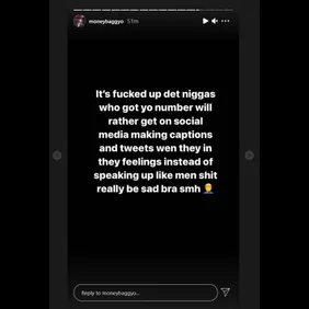"It's f*cked up det n*ggas who got yo number will rather get on social media making captions and tweets wen they in they feelings instead of speaking up like men," Moneybagg penned in his Instagram Story. "Sh*t really be sad bra smh [facepalm emoji]." In another slide, he added, "It's Really F*CK U N*GGAS I KNO U ACTING LIKE U WIT ME."