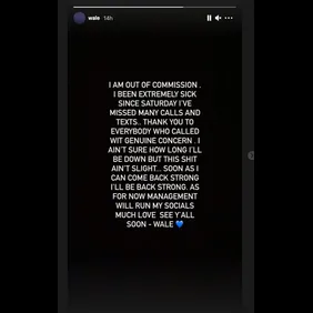 "I am out of commission. I been extremely sick since Saturday," revealed Wale on Instagram. "I've missed many calls and texts.. Thank you to everybody who called wit genuine concern. I ain't sure how long I'll be down but this shit ain't slight... Soon as I can come back strong I'll be back strong. As for now management will run my socials. Much love, see y'all soon."