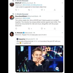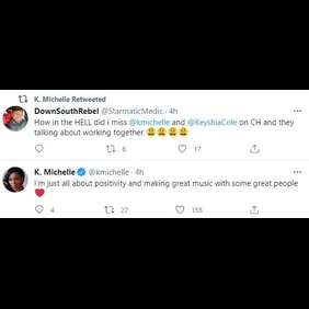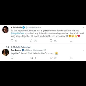 "So last night on clubhouse was a great moment for the culture. Me and @KeyshiaCole squashed any little misunderstandings we had like adults and sang songs together all night. Y’all might even see a joint EP," wrote Michelle. "I’m just all about positivity and making great music with some great people."