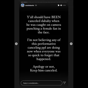 "Y'all should have BEEN canceled dababy when he was caught on camera punching a female fan in the face," she wrote. "I'm not believing any of this performative canceling ppl are doing now when everyone was so quick to forget that happened. Apology or not, keep him canceled."