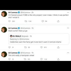 "I didn’t even think I deserved to say I’m famous but it’s true to somebody and it’s intense." Ari also said that she's proud of Shea Butter Baby and if that's the only studio album she releases, she's okay with that. "I think it was perfect and I wrote it." Check out her tweets below.