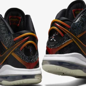 As you can see in the images below, this Nike LeBron 8 comes with a mostly black upper that has some silver piping throughout, which is meant to be a nod to the digital universe within the Space Jam movie. The Nike swoosh is silver with an orange outline and if you pay attention to the sides, it becomes clear that orange is used quite a bit on this shoe. As for the back heel, one side has a cartoon version of LeBron dunking, while the other sneaker has Bugs Bunny.