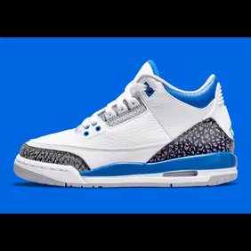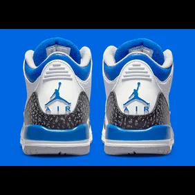 In the images below, you can see how this shoe has a mostly white leather upper all while the rest of the sneaker has blue highlights. From there, we have some grey elephant print on the toe box and the back heel, which brings forth those infamous Jordan 3 aesthetics. Overall, it is a colorway that can be worn by everyone and it certainly goes with plenty of different outfits.