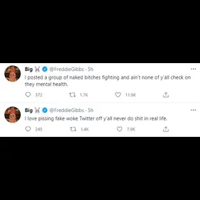 Throughout the day, Gibbs received backlash over his posts, with some people jumping in his mentions to condemn him allegedly exploiting the women. Gibbs didn't respond directly to any one person, but he offered up a thought. "I love pissing fake woke Twitter off y’all never do sh*t in real life," he said. "I posted a group of naked b*tches fighting and ain’t none of y’all check on they mental health."