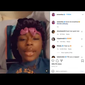 The first slide of The Shade Room's post feature's Omeretta's reaction to Lil Baby's release of "On Me (Remix)" with Megan Thee Stallion juxtaposed beside her March freestyle over the "On Me" instrumental. Under the post of her freestyle, Lil Baby notably commented, "I hear ya," but as many disappointed fans have pointed out today, Omeretta is nowhere to be found on the "On Me" remix. As news broke about Lil Baby's new release, Omeretta took to her Instagram story to vent, saying, "I'm happy y'all seeing this sh*t for what it is...NEW MUSIC ON THE WAY I'M NOT LETTING UP."