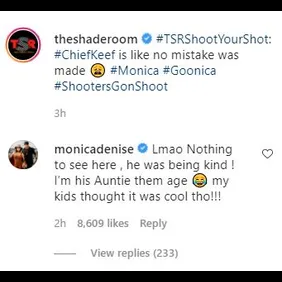 "Nah that was about you! @monicadenise," the rapper wrote. After The Shade Room reposted the exchange, Monica slid in the comments with a final thought. "Lmao Nothing to see here , he was being kind ! I’m his Auntie them age [crying laughing emoji] my kids thought it was cool tho!!!" Check out the posts below.