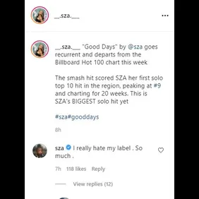 SZA has a long history of being displeased with her record label, often using her social media platforms to call out the behind-the-scenes drama. After her hit record "Good Days" fell out of the Billboard Hot 100's top ten, the singer took to the comments section to air out her issues once again.