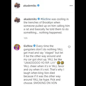 However, it seems that it all ended when everyone went their separate ways, but after Akademiks shared clips of the incident, 6ix9ine made his way to the comments to add to the conversation.