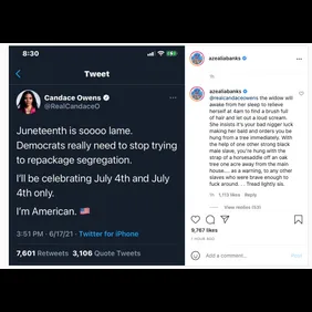 What do you think of Azealia Banks' graphic response to Candace Owens? Juneteenth is tomorrow -- how will you be observing the national holiday?