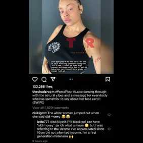 "Hoe don't let them wigs, makeup, and stage outfits fool u I got old money and carry myself like a grown ass woman that's all," she continued. The Shade Room reposted the rapper's message and someone commented that "the white woman jumped out when she said old money." Latto, who is biracial, has received such comments in the past, so she took a moment to address the person.