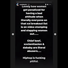 "Lovely how women get penalized for having a bad attitude when literally everyone on that xxl breakout list is on video stomping and slapping women out...... Chief keef, xxxtenttacion & dababy are literal abusers...... Hiphop is f*cking pitiful."