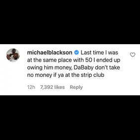 "Last time I was at the same place with 50 I ended up owing him money, DaBaby don’t take no money if ya at the strip club," commented Michael Blackson, ensuring that the rapper never gets on Fiddy's bad side. We've all witnessed the wrath of "Fofty" and it's not a pretty sight. Baby would be smart to avoid any money-lending situations with Fif.