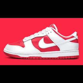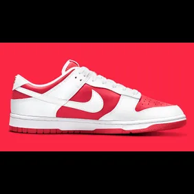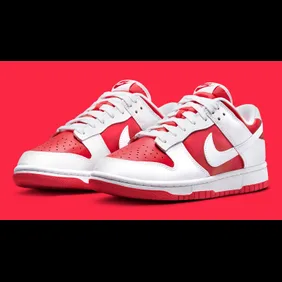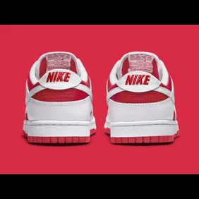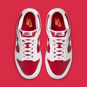 In the images below, you can see that the base of the shoe is red, all while the overlays are white. This colorway has been deemed "Championship Red" and the layout is the reverse of what you would expect as most shoes make the base white and the overlays red. Technicalities aside, this is another dope Nike Dunk Low that is sure to captivate fans.