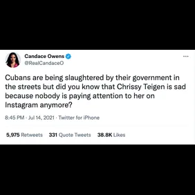 As she expected, her message was indeed picked apart by a few people, including conservative political commentator Candace Owens. She tweeted, "Cubans are being slaughtered by their government in the streets but did you know that Chrissy Teigen is sad because nobody is paying attention to her on Instagram anymore?"
