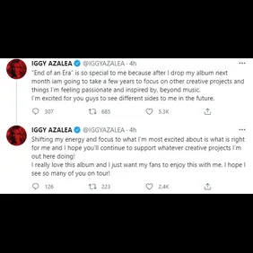 On Thursday (July 15), Azalea made an announcement via her Twitter account that following the release of End of an Era, she'll be taking a break from music as she shifts attention to "creative projects."