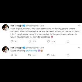 NLE Choppa has long taken a stance against the COVID-19 vaccine, and he shared on Twitter that he backs Irving and his decision to remain unvaccinated.