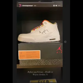 "Before any Verzuz... Drake vs Wayne Jordan 3's," wrote Drake on Instagram Stories on Thursday night. He took a picture of the white Air Jordan 3 collaboration, which was autographed by Tunechi.