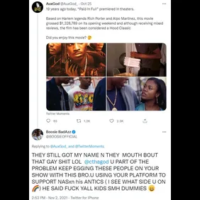 "THEY STILL GOT MY NAME N THEY MOUTH BOUT THAT GAY SH*T LOL @cthagod U PART OF THE PROBLEM KEEP EGGING THESE PEOPLE ON YOUR SHOW WITH THIS BRO.U USING YOUR PLATFORM TO SUPPORT NASxn his ANTICS ( I SEE WHAT SIDE U ON [rainbow emoji]) HE SAID F*CK YALL KIDS SMH DUMMIES."