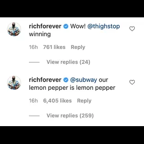Regardless, rappers, producers, and celebrities alike have taken the opportunity to react to Subway's tuna sandwich essentially being exposed. Rick Ross slammed the sandwich restaurant's lack of transparency and promoted Wing Stop's new offshoot Thigh Stop. "Wow! @thighstop winning," the Port of Miami 2 wrote under Complex's Instagram post about Subway. "@subway our lemon pepper is lemon pepper."