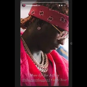 "More life for Jeffrey," wrote Drake on Instagram Stories, sharing a picture of the eccentric rapper. "@thuggerthugger1 Curry Year," he continued, making a reference to one of his favorite hoopers, Stephen Curry.