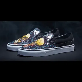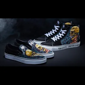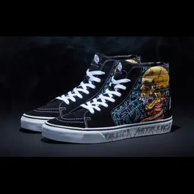 In the images below, you can find a pair of Vans Slip-Ons as well as a pair of Vans Sk8-His. These are two of the most popular Vans models and they fit the Metallica aesthetic quite well. Both pairs feature skulls and shattered glass imagery that aligns well with the band's look from the past 35 years. The Sk8-His even has "Metallica" written on the midsole, while the Slip-Ons have Metallica branding near the back heel.