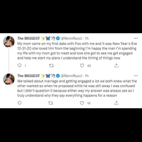 "My mom came on my first date with Foo with me and it was New Year’s Eve 12-31-20 she loved him from the beginning I’m happy the man I’m spending my life with my mom got to meet and love she got to see me get engaged and help me start my plans I understand the timing of things now."