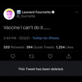 "Vaccine I can't do it..." Fournette wrote before deleting the tweet as well. Needless to say, these players have strong feelings on the jab, but realize the backlash isn't worth keeping up their tweets.