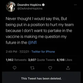 One such player is Arizona Cardinals wide receiver Deandre Hopkins who is adamant about not receiving the vaccine. In fact, he recently took to Twitter saying "Never thought I would say this, but being put in a position to hurt my team because I don't want to partake in the vaccine is making me question my future in the NFL." Hopkins eventually deleted the tweet although the sentiment was shared by other players, like Leonard Fournette.