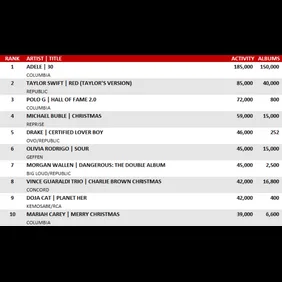 According to HitsDailyDouble, there just wasn't any catching up to Adele this week, who will stay put at #1 with over 185,000 album units moved. Taylor Swift's re-recorded version of Red will hit #2, and Polo G is looking set to sweep in right beneath her with 72,000 equivalent album units. Much of those numbers are from streaming. Adele and Taylor's numbers come mostly from pure sales.