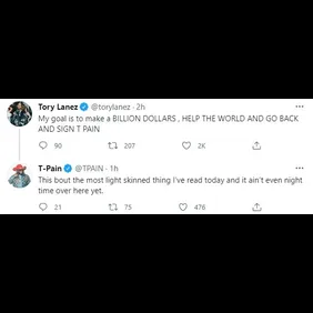 About an hour ago, Tory Lanez returned to Twitter, this time with a tweet that captured the attention of his repeat collaborator T-Pain. "My goal is to make a BILLION DOLLARS , HELP THE WORLD AND GO BACK AND SIGN T PAIN," Lanez wrote. It was chalked up as a joke by fans, but T-Pain couldn't pass up the opportunity and issued a response.