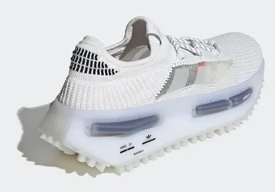 In the images below, you can see what is being described as the Adidas NMD_S1 which will debut in a mostly white colorway. What makes this model truly unique compared to past NMD is the fact that the midsole is so massive. In fact, it reminds us of the new UltraBoost midsoles which are known for their added bounce. There are still blocks on the sides although they are surrounded by a translucent cage. As for the upper, Primeknit makes its return for that comfort fans know and love.