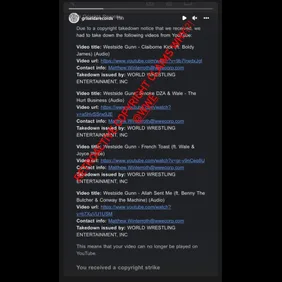 "Due to a copyright takedown notice that we received, we had to take down the following videos from YouTube," the note read before listing off the videos. It included, "Takedown issued by: WORLD WRESTLING ENTERTAINMENT, INC." Over the image, someone wrote, "Retroactive copyright claims why!?! @WWE."