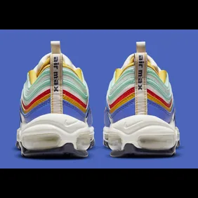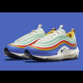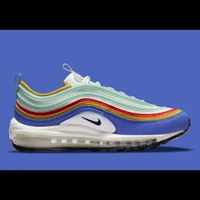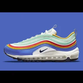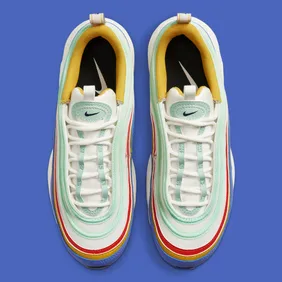 In the official images below, you can see that the latest Air Max 97 model is a multi-color offering that has some crisp lines on top of a white base. From the bottom up, we have a nice shade of blue, some yellow, red, and then mint green to add the cherry on top. These are great for summer and will prove to look nice alongside an all-black or all-white fit.
