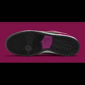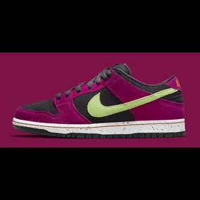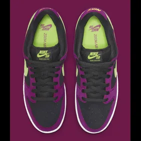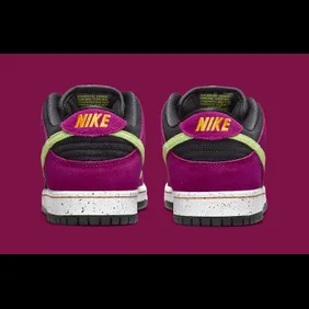As you can see, this shoe has black nubuck on the toe box and side panels, all while the overlays have this reddish-purple hue to them. From there, the Nike swoosh on the side is light green, which adds an extra bit of vibrancy to the overall look of the shoe. All-in-all, this is a great colorway for the summer and if you are a fan of the classic Nike SB Dunk Low look, then these are a must-cop.