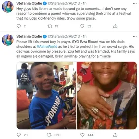 "The 9 YO boy is in coma right now & brain swelling has gotten progressively worse today after he was trampled at #Astroworld .family does not want his name shared right now, but please lift this child in prayer. He didn’t deserve this. We hear from Grandfather at 5 @abc13houston." She later shared his name at the family's request.