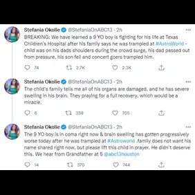 "We have learned a 9 YO boy is fighting for his life at Texas Children’s Hospital after his family says he was trampled at #AstroWorld -child was on his dads shoulders during the crowd surge, his dad passed out from pressure, his son fell and concert goers trampled him," Okolie tweeted. She reportedly spoke with family members who say that a full recovery would be a "miracle."
