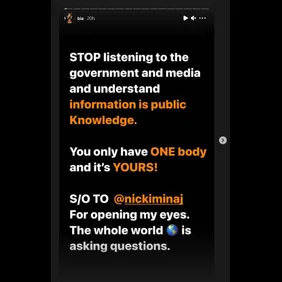 "STOP listening to the government and media and understand information is public Knowledge," Bia wrote on her Instagram Story. "You only have ONE body and it's YOURS. S/O TO @nickiminaj for opening my eyes. The whole world [world emoji] is asking questions."