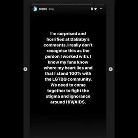 "I'm surprised and horrified at DaBaby's comments," wrote Dua on Instagram Stories. "I really don't recognise this as the person I worked with. I know my fans know where my heart lies and that I stand 100% with the LGTBQ community. We need to come together to fight the stigma and ignorance around HIV/AIDS."