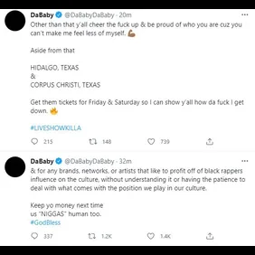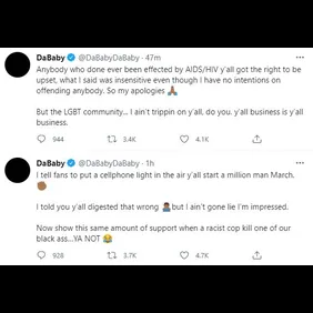 "Anybody who done ever been effected by AIDS/HIV y’all got the right to be upset, what I said was insensitive even though I have no intentions on offending anybody. So my apologies But the LGBT community... I ain’t trippin on y’all, do you. y’all business is y’all business," DaBaby continued. "[And] for any brands, networks, or artists that like to profit off of black rappers influence on the culture, without understanding it or having the patience to deal with what comes with the position we play in our culture. Keep yo money next time us 'N*GGAS' human too."
