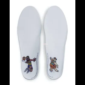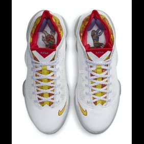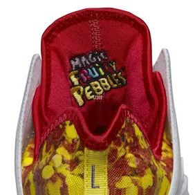 The shoe is mostly constructed with some white mesh, although the big difference here is that the under upper of the shoe is a graphic of yellow and pink fruity pebbles. The cereal's colors are found all the way throughout, and on the insoles, we get a Flinstone version of LeBron James, all while Fred Flinstone is on the other sneaker. It makes for a dope collab that will certainly have collectors excited.