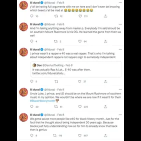 "J prince wasn’t a rapper e 40 was a real rapper," Duval responded. "That’s who I’m talking about independent rappers not rappers sign to somebody independent." Soon, people were storming his mentions with their reactions and names that they believed deserved more credit or recognition. "Uncle Luke, J prince, and JD should be on the Mount Rushmore of southern music in my opinion. We wouldn’t be where we are now if it wasn’t for them #BlackHistorymonth."